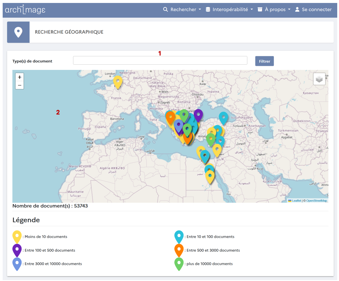 Chaque tag de couleur mentionne l'existence de documents pour le site en question. Un code couleur en bas de la carte vous permet d'avoir une estimation du nombre de documents.