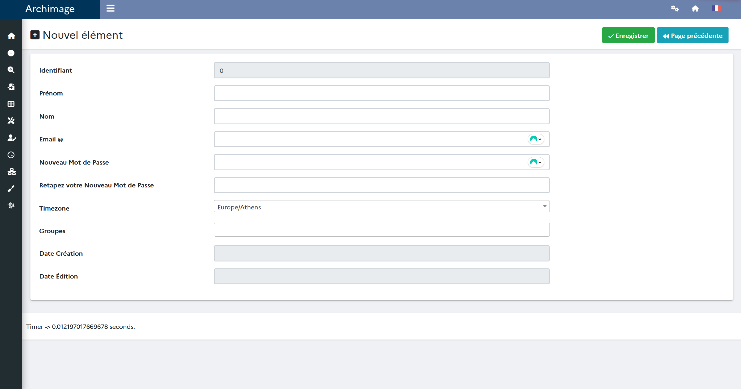 Cliquez sur "Ajouter un élément" et complétez les rubriques "Prénom", "Nom" et "Email @" puis configurez le mot de passe de l'utilisateur avec la rubrique "Nouveau Mot de Passe" et en le répétant dans la rubrique "Retapez votre Nouveau Mot de Passe". Enfin, sélectionnez le fuseau horaire associé à l'utilisateur avec le menu déroulant de la rubrique "Timezone".