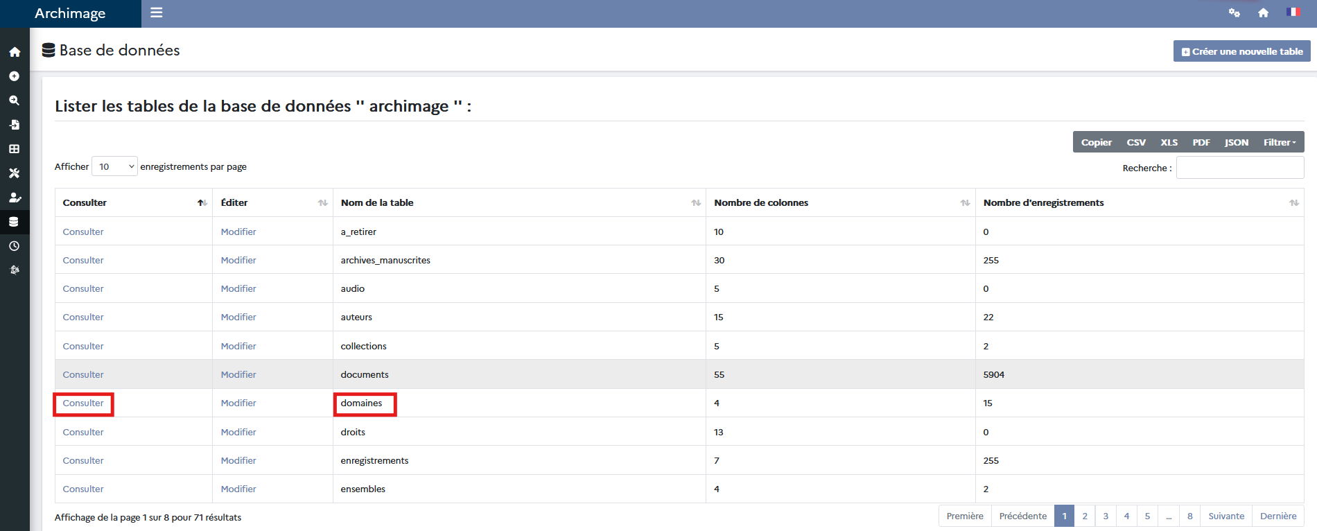 2. Trouver la table domaines, puis cliquer sur Consulter