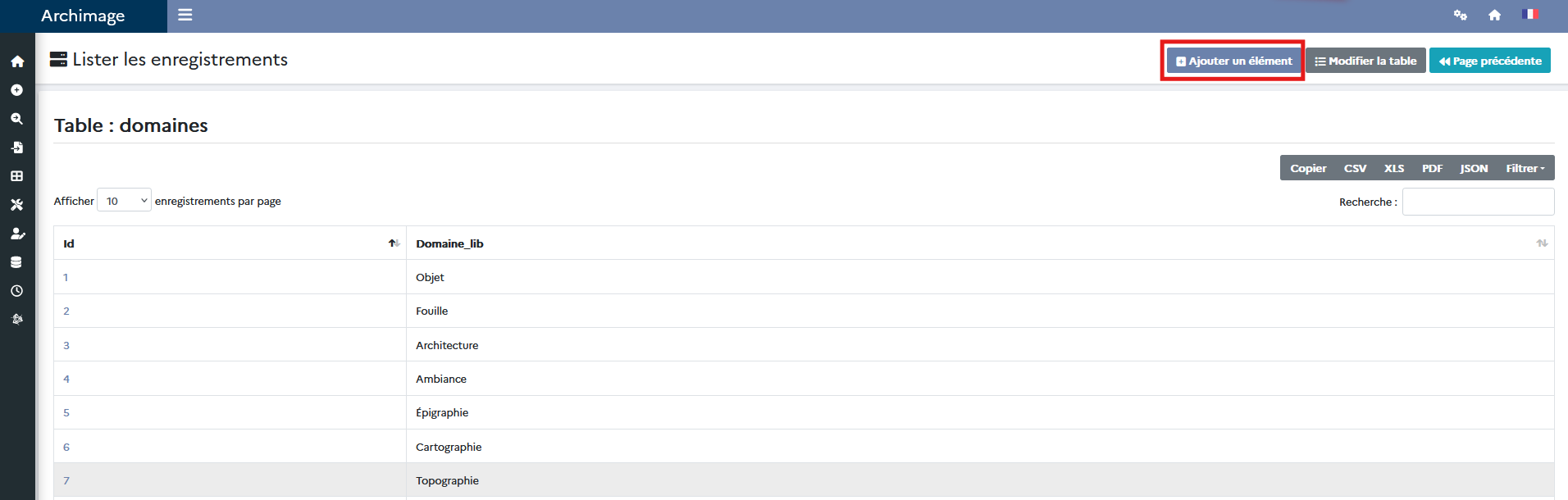 Si la liste des tables n'est pas accessible dans votre menu, saisir le lien suivant : https;//archimage.votreécole.votredomaine/index.php?kroute=show_all_tables