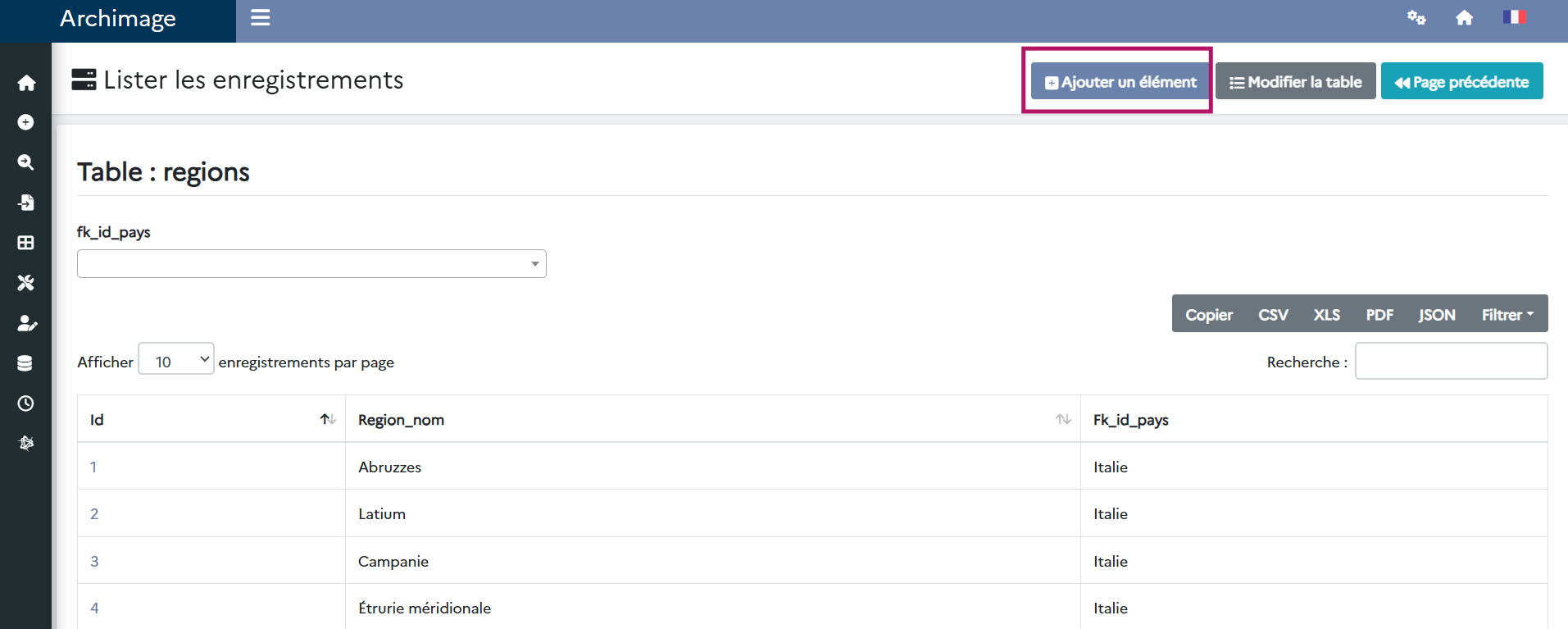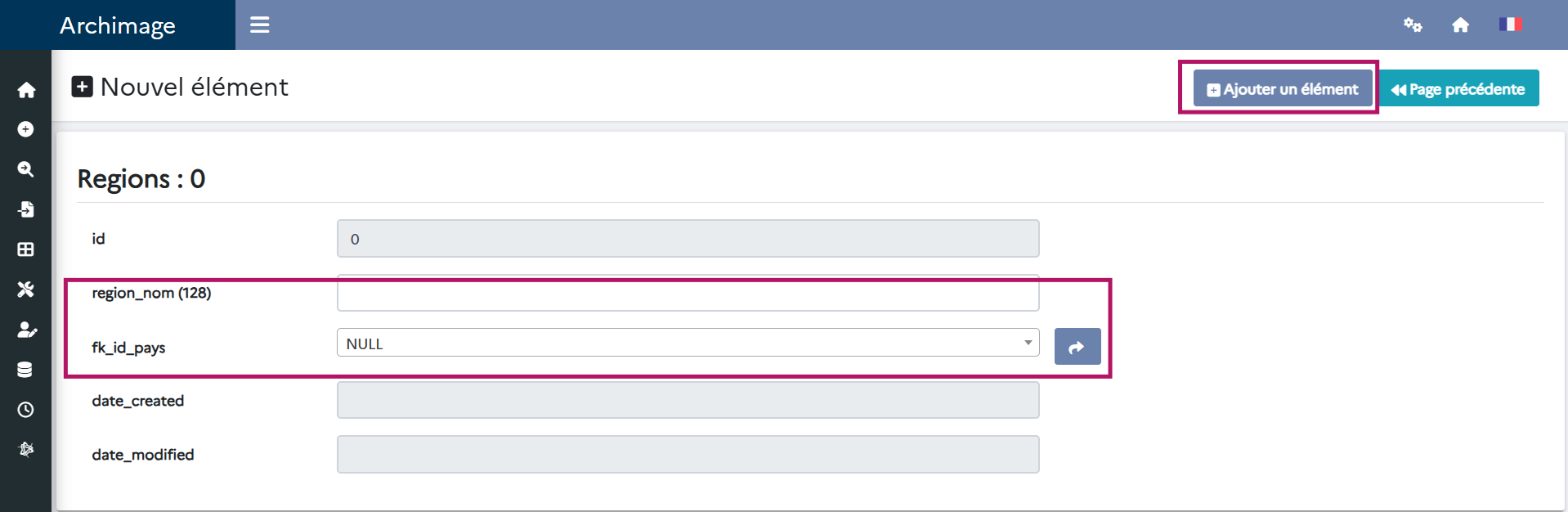 4. Remplir la fiche et cliquer de nouveau sur Ajouter un élément pour enregistrer votre travail. Attention, pour être valable, l'entité "région" doit être rattachée à l'entité "Pays" via la liste déroulante.