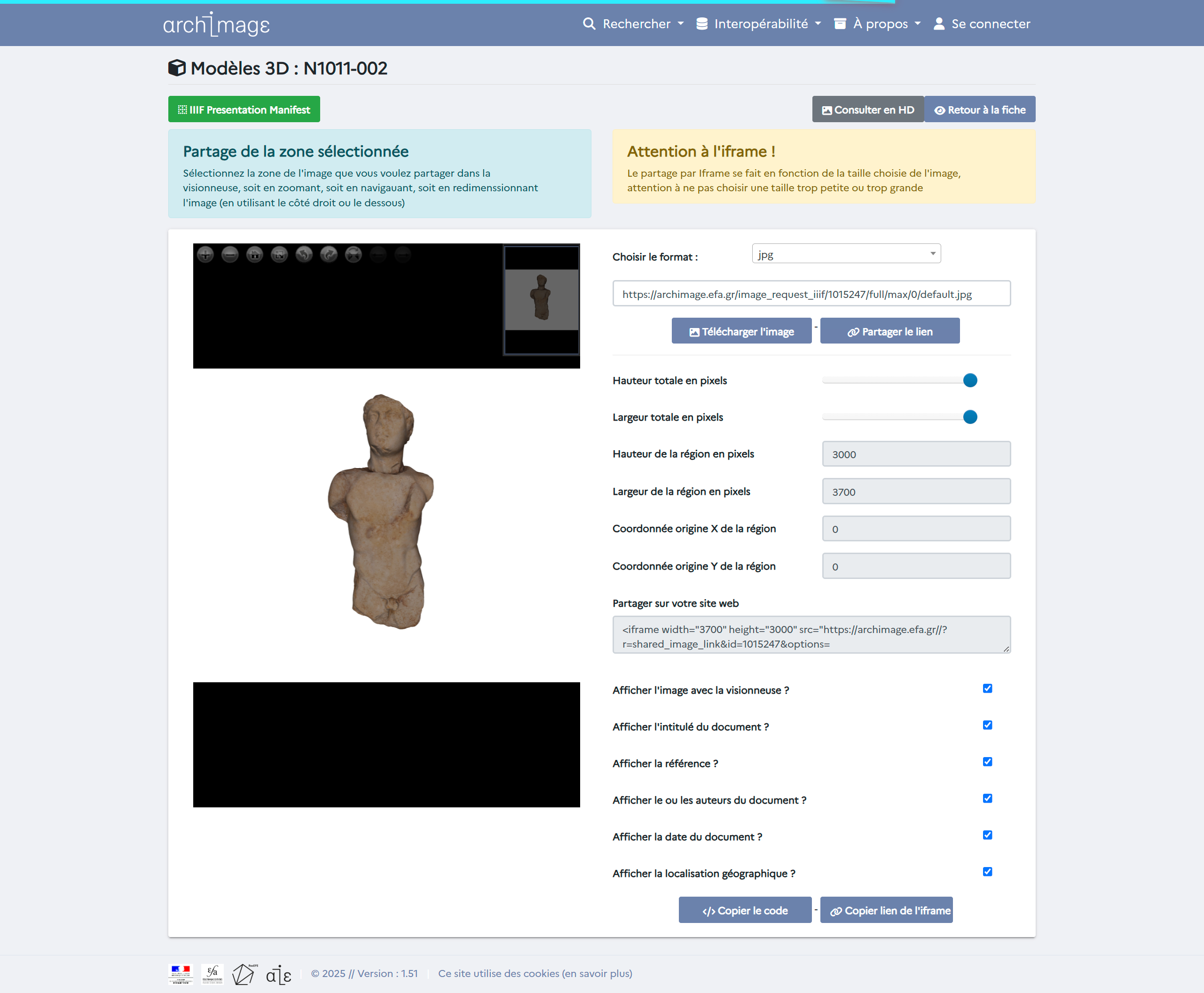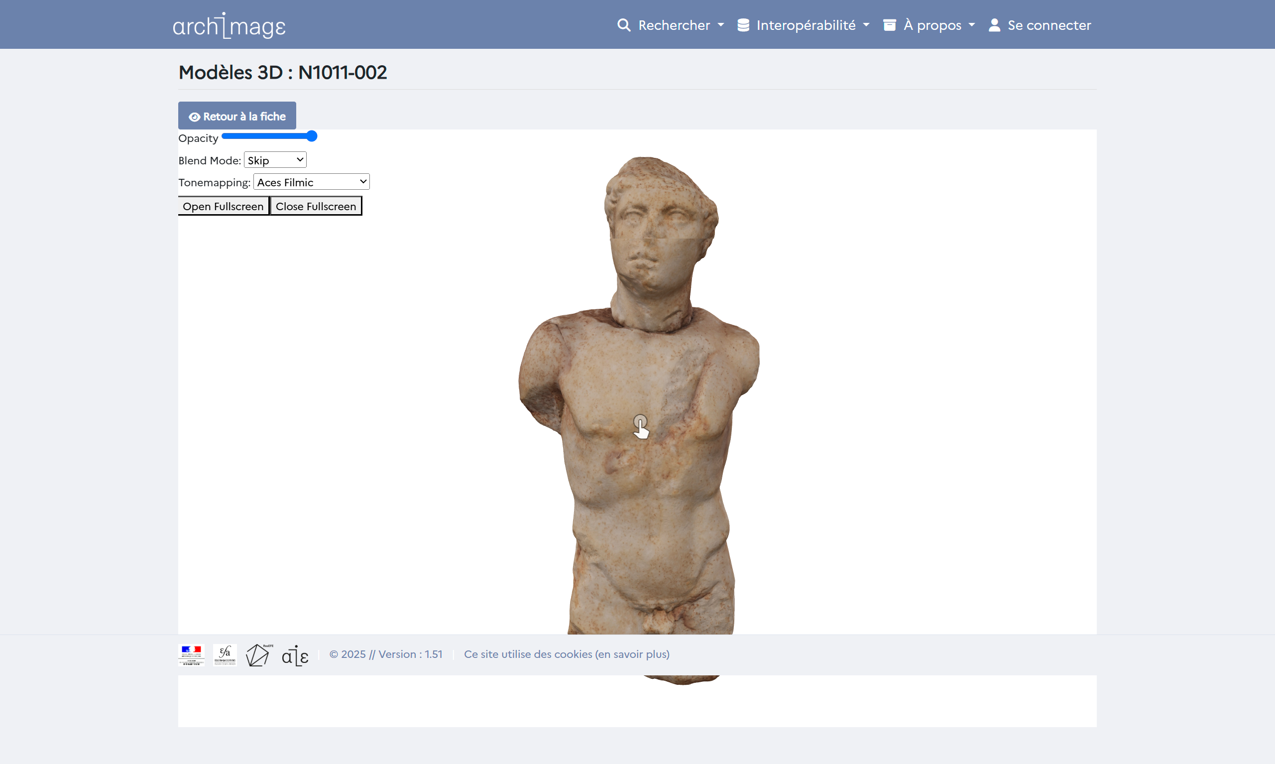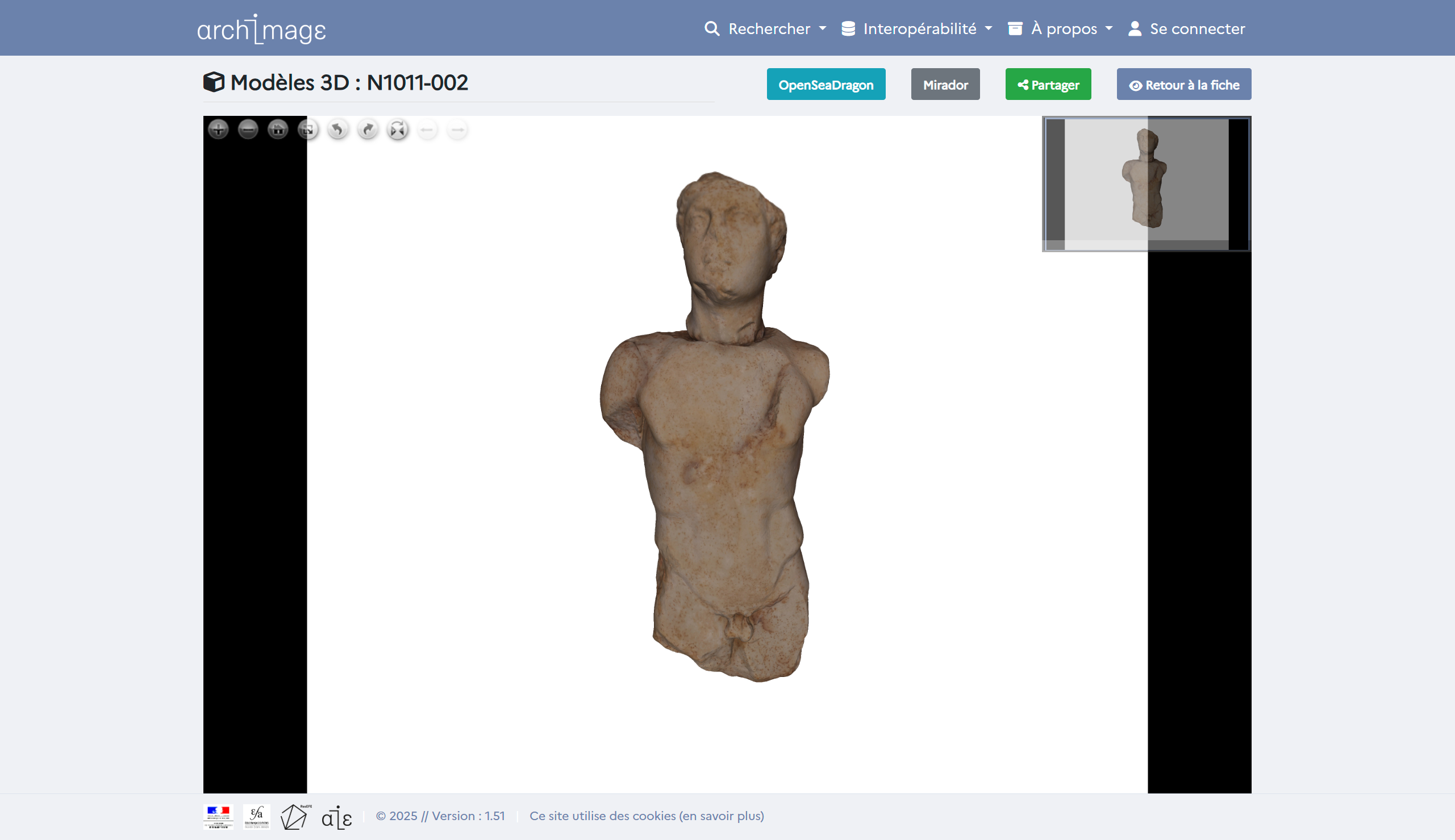 Un bouton « Consulter en HD » permet de consulter la photographie de référence de l’objet modélisé en 3D en haute définition, de zoomer, de changer l’orientation de l’image ou de l’afficher en plein écran.